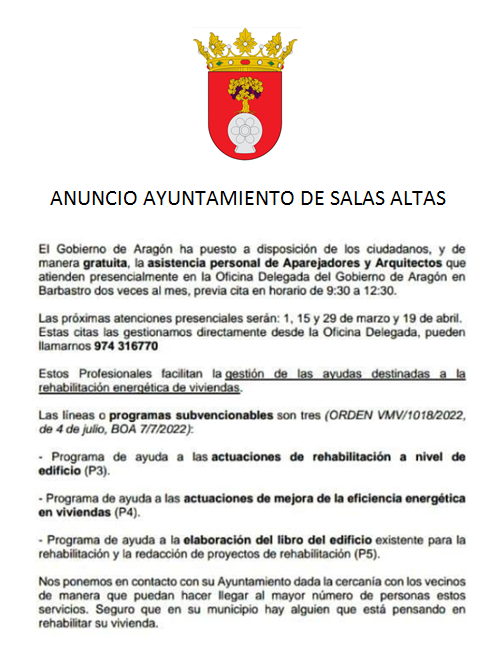El Gobierno de Aragón ha puesto a disposición de los ciudadanos, y de manera gratuita, la asistencia personal de Aparejadores y Arquitectos que atienden presencialmente en la Oficina Delegada del Gobierno de Aragón en Barbastro, dos veces al mes, previa cita, en horario de 9:30h a 12:30h.
