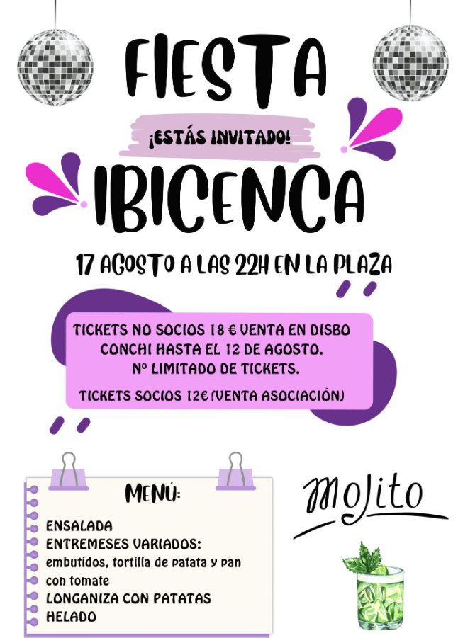 - Sábado, 17. Fiesta Ibicenca. Se pueden adquirir las entradas de la cena hasta el día 12.