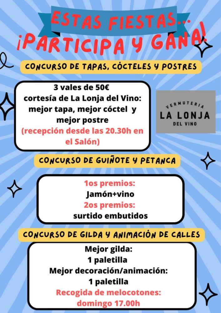 - Concurso de gilda y animación de calles. Premio mejor gilda: una paletilla. Premio mejor decoración/animación: una paletilla. Recogida de melocotones el domingo a las 17h.