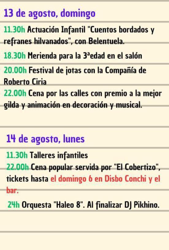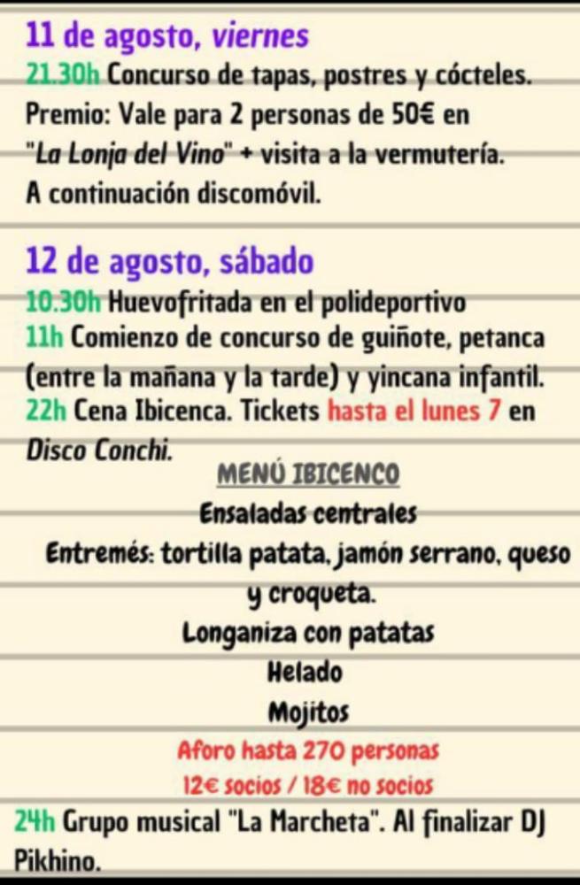 Concursos de tapas, postres y cócteles, una huevofritada, concurso de guiñote, petanca y yincana infantil, sesiones de baile, Dj, cuenta cuentos, jotas, merienda para los mayores, talleres infantiles, cena popular, fiesta de la espuma, misa, juegos infantiles, jamonada y la súper Cena Ibicenca, son algunas de las actividades organizadas.