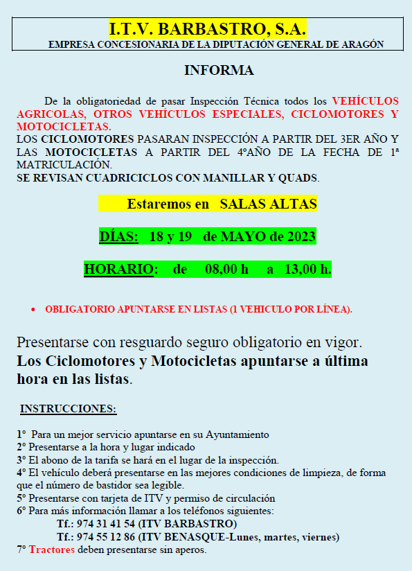 ITV Barbastro S.A. informa que los días 18 y 19 de mayo, en Salas Altas tendrá lugar la Inspección Técnica de Vehículos Agrícolas, otros vehículos especiales, ciclomotores y motocicletas. También se revisarán cuadriciclos y quads.