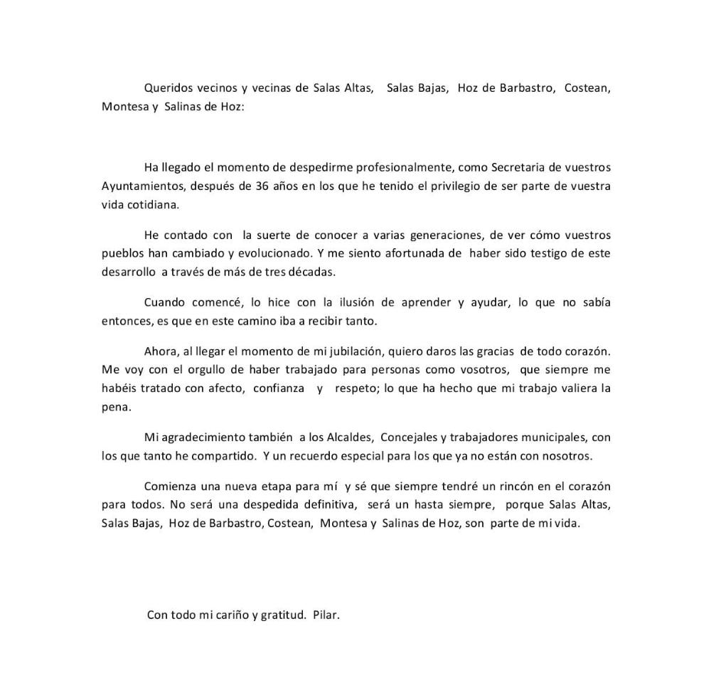 Con tal motivo, Mª Pilar ha enviado una carta a toda la población en la que señala que "ha tenido el privilegio" de ser parte de la vida cotidiana de Salas Altas. A este respecto ha recordado que ha contado "con la suerte de conocer a varias generaciones, de ver cómo vuestros pueblos han cambiado y evolucionado. Y me siento afortunada de haber sido testigo de este desarrollo a través de más de tres décadas".