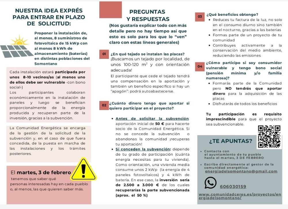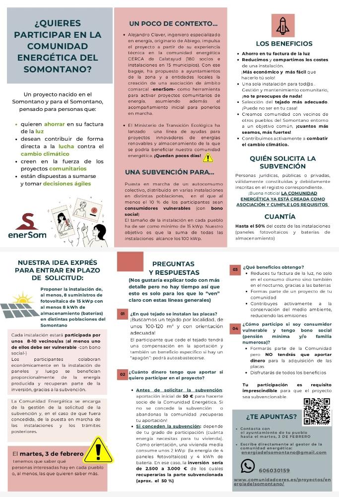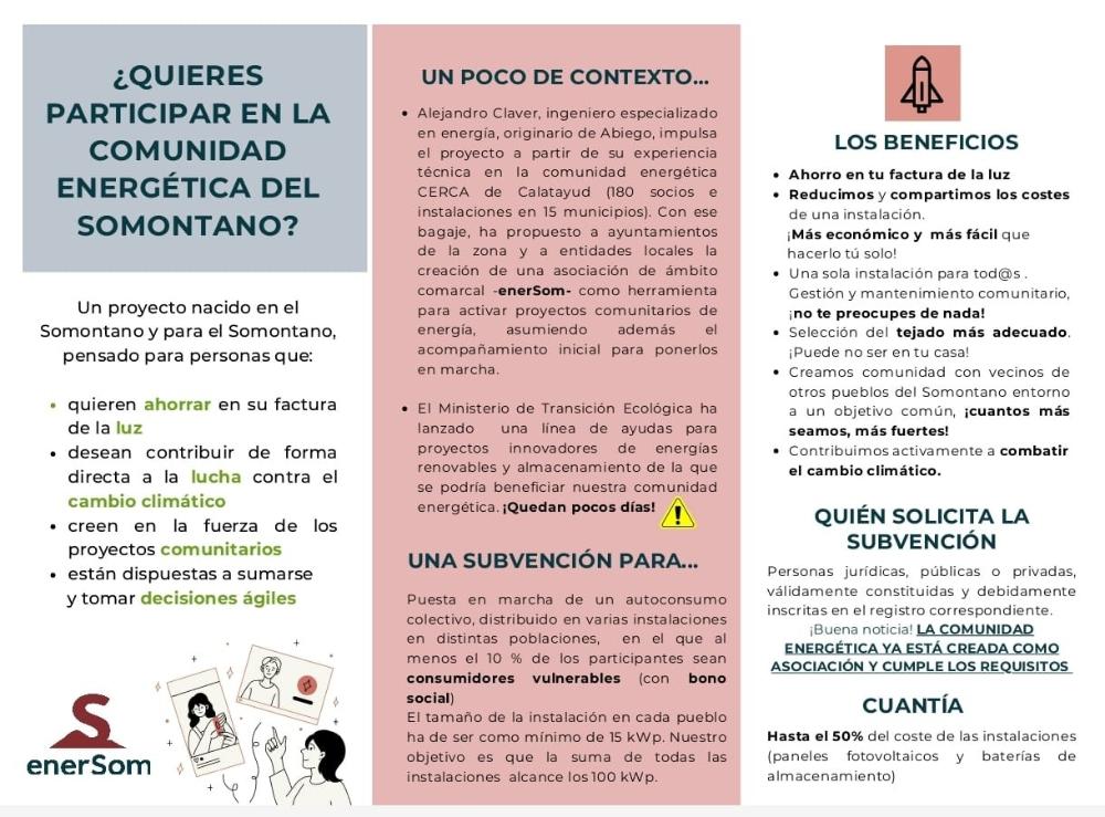 Asimismo, pueden enviar un correo electrónico al gestor de la comunidad energética, Alejandro Claver, a energiadelsomontano@gmail.com , o bien, llamarle por teléfono al número 606030159.