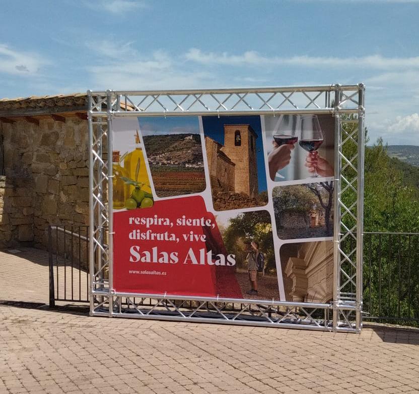 Una gran lona publicitaria llena de imágenes representativas de la localidad luce desde hoy en la localidad de Salas Altas al objeto de atraer a nuevos turistas al territorio.