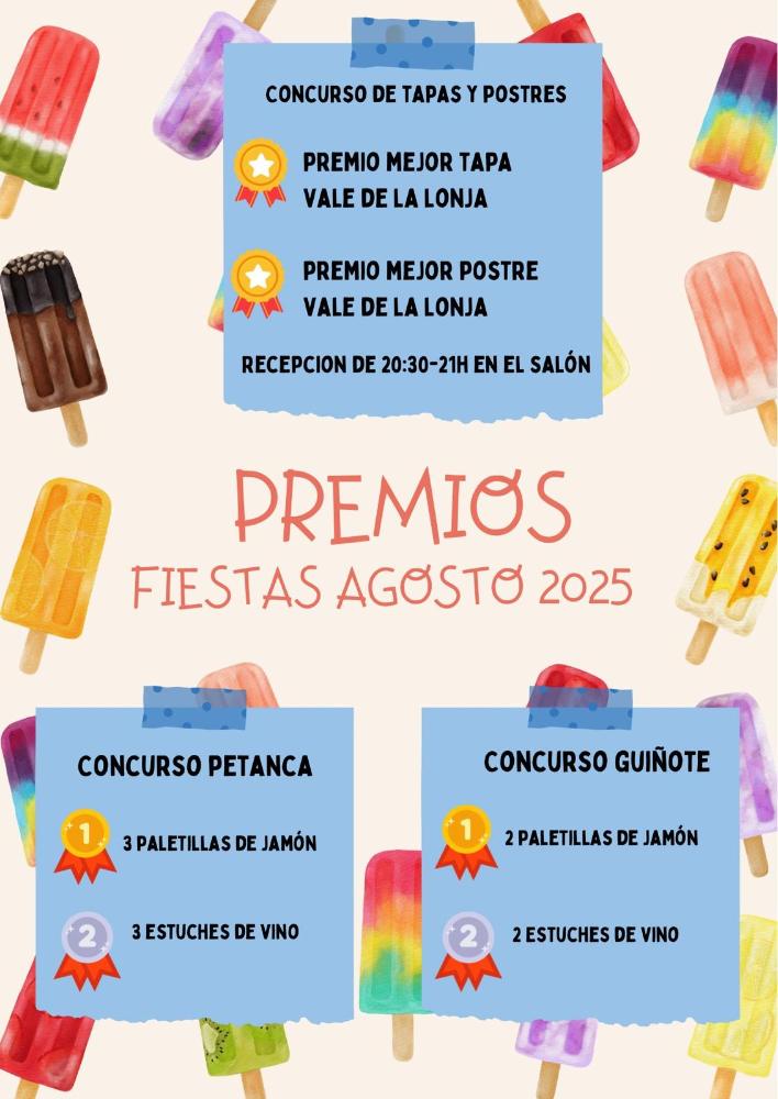 Concurso de tapas y postres en La Plaza el miércoles día 13. Premio "Mejor Tapa" y premio "Mejor Postre", ambos dotados con un Vale de La Lonja. Recepción de las muestras de 20:30h a 21h en el salón social.