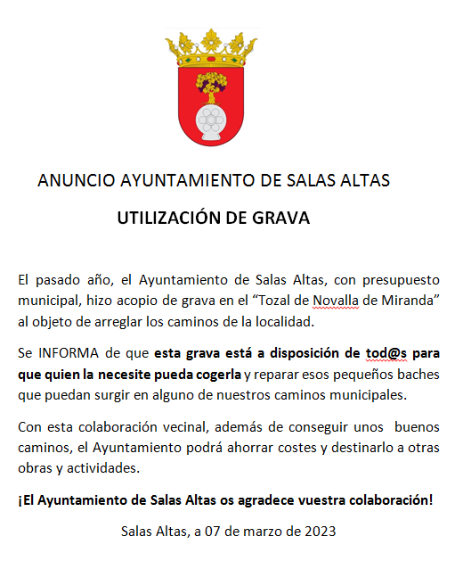 El pasado año, el Ayuntamiento de Salas Altas, con presupuesto municipal hizo acopio de grava en el Tozal de Novalla de Miranda al objeto de arreglar los caminos de la localidad.